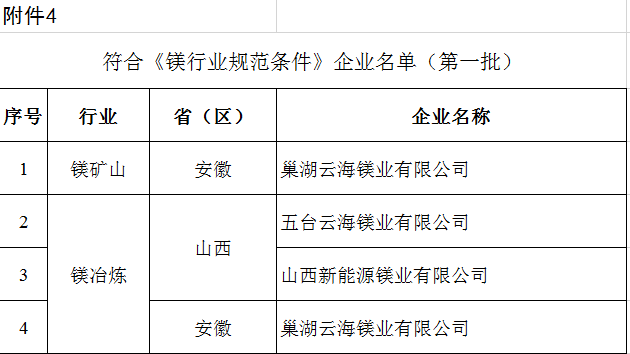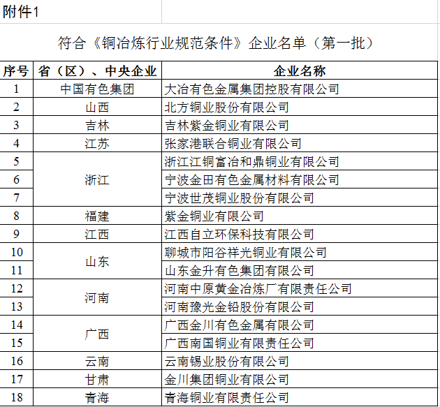 根据《铜冶炼行业规范条件》(工业和信息化部公告2019年第35号)、《铝行业规范条件》(工业和信息化部公告2020年第6号)、《铅锌行业规范条件》(工业和信息化部公告2020年第7号)、《镁行业规范条件》(工业和信息化部公告2020年第8号),经企业申报、地方行业主管部门核实、专家组审核、现场核查、征求部门意见及网上公示等程序,我部确定了符合规范条件的企业名单(第一批),现予以公告。
