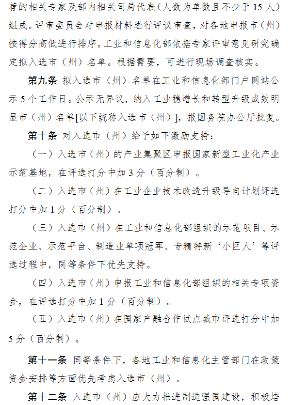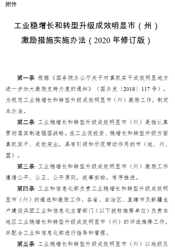 一、请各省、自治区、直辖市及新疆生产建设兵团工业和信息化主管部门(以下统称各地)按照修改完善后的《工业稳增长和转型升级成效明显市(州)激励措施实施办法(修订版)》(详见附件),积极组织评选推荐。