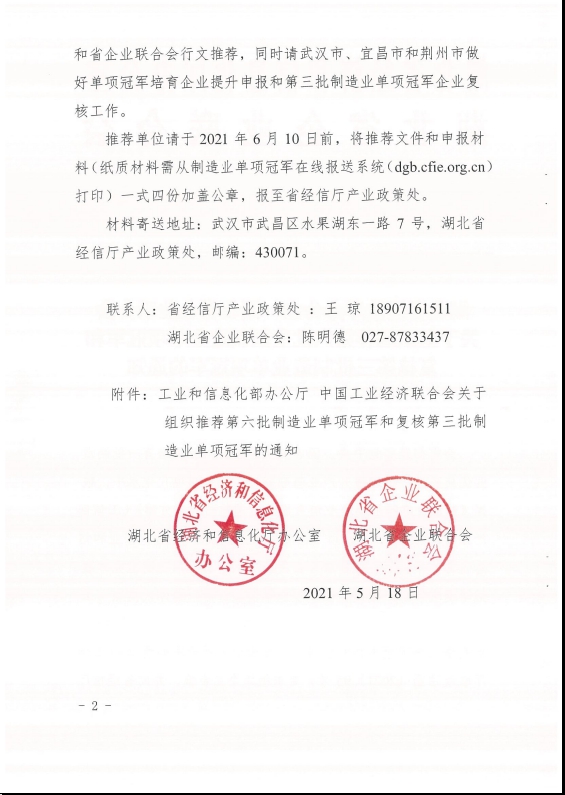 (四)报送时间和方式。申报截止时间为2021年6月30日。申报采取网上填报与纸质报送相结合的方式。网上通过制造业单项冠军在线报送系统(dgb.cfie.org.cn)统一申报。由企业在线填写并上传相关材料,经组织单位审核后报送(具体填报和审核方式参见报送系统主页说明)。纸质材料要与网上填报一致,一式两份,连同正式上报文件,报工业和信息化部和中国工业经济联合会(相关材料由后者代收)。