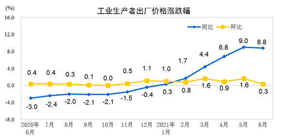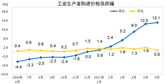2021年6月份,全国工业生产者出厂价格同比上涨8.8%,环比上涨0.3%;工业生产者购进价格同比上涨13.1%,环比上涨0.8%。上半年,工业生产者出厂价格比去年同期上涨5.1%,工业生产者购进价格上涨7.1%。