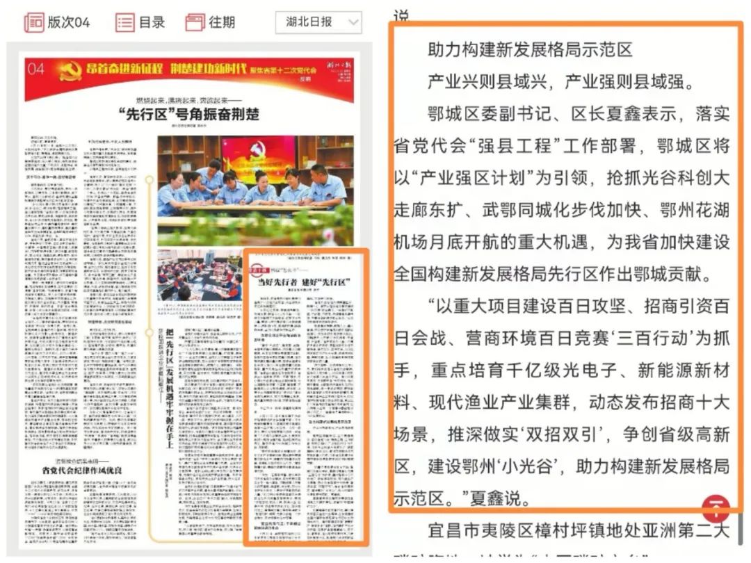 连日来,湖北省党员干部认真学习省第十二次党代会报告,关注湖北未来五年发展蓝图。2022年6月22日,《湖北日报》第4版刊发鄂城区委副书记、区长夏鑫学习贯彻省第十二次党代会精神的体会发言,现予转载!