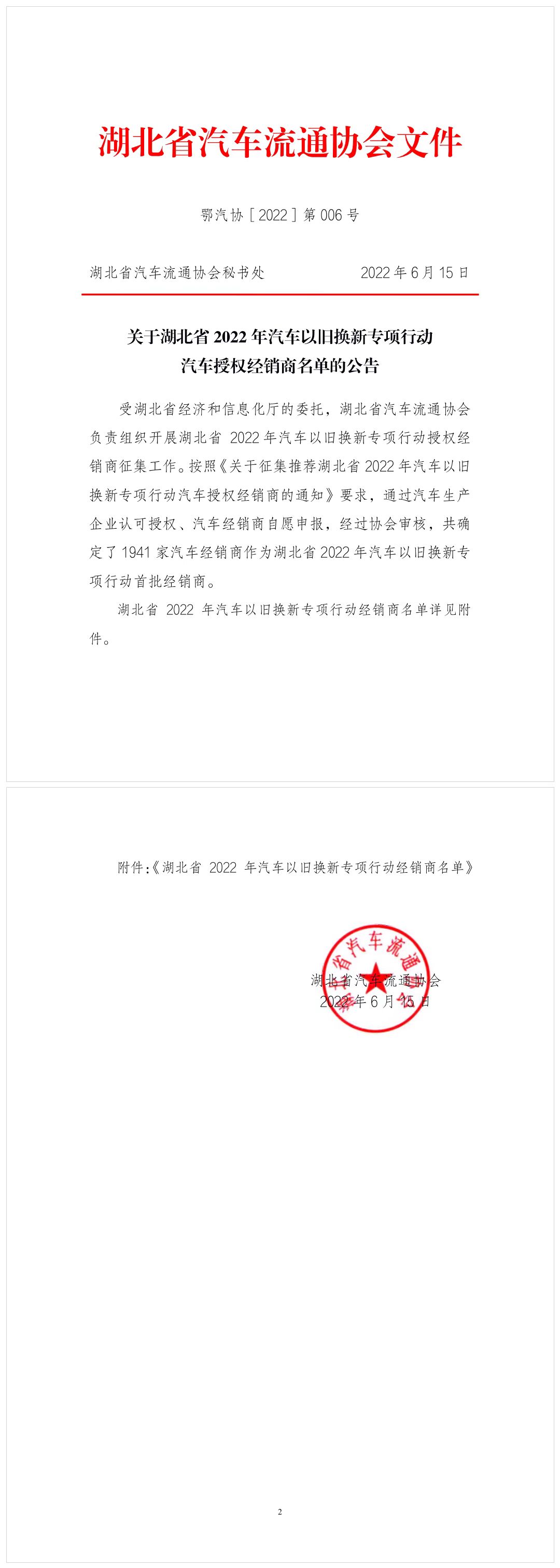 关于湖北省2022年汽车以旧换新专项行动汽车授权经销商名单的公告