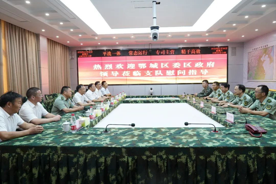 来到武警鄂州支队,董国平、夏鑫观看了武警支队专题片,详细解了官兵训练执勤情况。董国平指出,安全稳定的社会环境离不开广大官兵默默奉献和付出,感谢他们为鄂城经济社会发展做出的贡献,向他们致以节日的问候。武警支队在抢险救灾、疫情防控等任务中勇担重担,成绩斐然,区委区政府和各个部门要学习武警支队优良作风,完成好落实好党委政府交办的各项任务。区委区政府将继续做好拥军优属和军地共建工作,积极做好后勤保障,保持和发扬优良传统,谱写双拥工作的新篇章。
