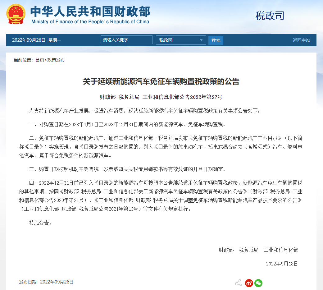 记者26日从财政部了解到,为支持新能源汽车产业发展,财政部、国家税务总局、工业和信息化部日前联合发布公告,明确将今年底到期的新能源汽车免征车辆购置税政策,延续实施至明年底。