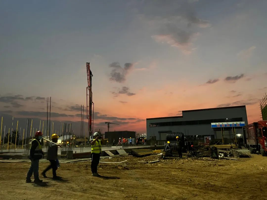 目前已完成办公区板房、职工生活区板房和厂区道路路基,正在进行基础施工。