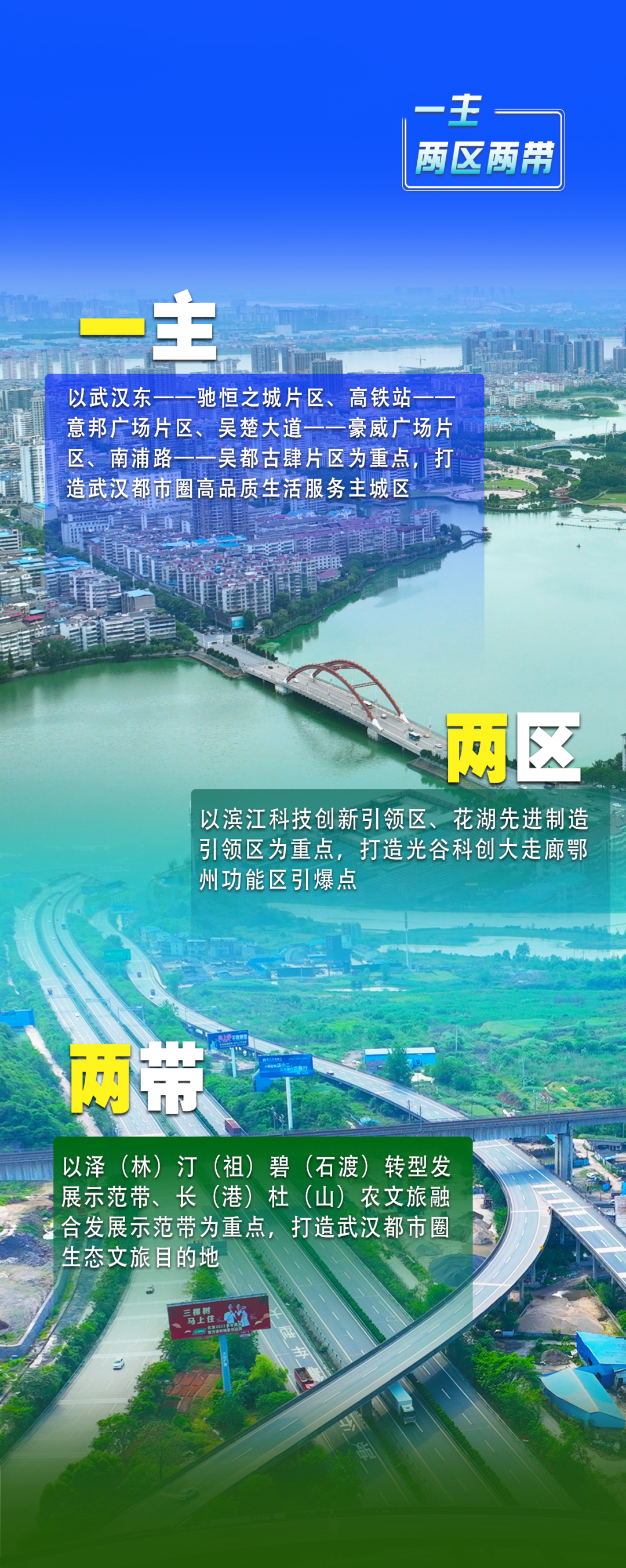 “一主”,就是以武汉东——驰恒之城片区、南浦路——吴都古肆片区、高铁站——意邦广场片区、吴楚大道——豪威广场片区为支点,大力实施南浦路、吴都古肆老城金十字片区改造升级工程,加快盘活豪威城市广场等商圈,全力打造宜居宜业宜游的高品质生活服务主城区。